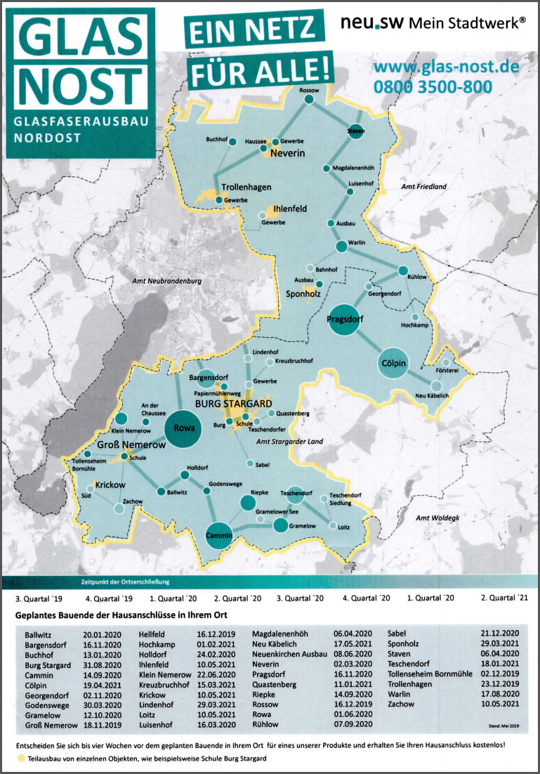 Mit dem symbolischen ersten Spatenstich in Neverin hat der Breitbandausbau im östlichen Umland von Neubrandenburg heute begonnen. Unter dem Namen GLAS NOST – für Glasfaserausbau Nordost – wird die neu.sw Tochtergesellschaft neu-medianet bis zum Sommer 2021 superschnelles Internet nach Burg Stargard, Cölpin, Groß Nemerow, Holldorf, Neuenkirchen, Neverin, Pragsdorf, Sponholz, Staven und Trollenhagen bringen. Diese Gemeinden gehören mit ihren Ortsteilen zum Projektgebiet, das den offiziellen Namen „MSE 24_25“ trägt. Im dargestellten Bild finden Sie einen Auszug aus der Pressemitteilung der Neubrandenburger Stadtwerke GmbH vom 15.07.2019, welcher sich durch einen Klick vergrößern lässt. | |